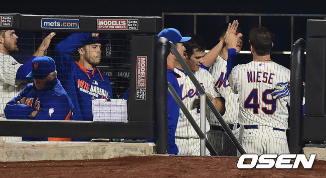 23일(이하 한국시간) 미국 뉴욕주 뉴욕 퀸스 시티 필드에서 열린 '2014 메이저리그' 뉴욕 메츠와 LA 다저스의 경기 5회말 2사 3루 대니얼 머피의 내야땅볼에 득점한 3루주자 존 니스가 덕아웃에서 동료들과 하이파이브를 하고 있다.