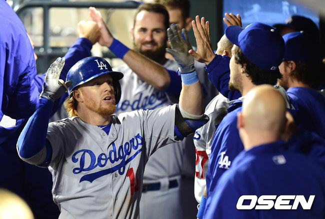 23일(이하 한국시간) 미국 뉴욕주 뉴욕 퀸스 시티 필드에서 열린 '2014 메이저리그' 뉴욕 메츠와 LA 다저스의 경기 7회초 1사 1루 저스틴 터너가 투런포를 치고 덕아웃에서 동료들과 하이파이브를 하고 있다.