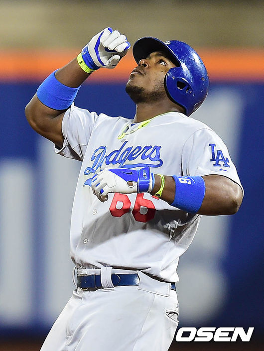 23일(이하 한국시간) 미국 뉴욕주 뉴욕 퀸스 시티 필드에서 열린 '2014 메이저리그' 뉴욕 메츠와 LA 다저스의 경기 8회초 1사 푸이그가 좌중간 2루타를 치고 세레모니를 하고 있다.