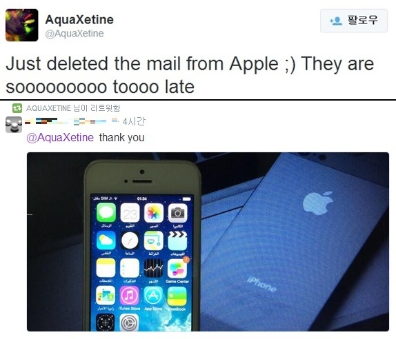 또, AquaXetine는 자신의 트위터 계정을 통해 "애플의 메일을 지웠다"며 그들이 너무 늦게 반응을 했다고 질책했고, iOS7의 활성화 기능을 무력화 시킨 방법을 만천하에 공개했다.