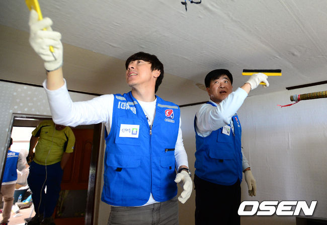 권오갑 총재, 신태용 K리그 홍보대사가 봉사활동에 나서 도배 작업을 하고 있다.