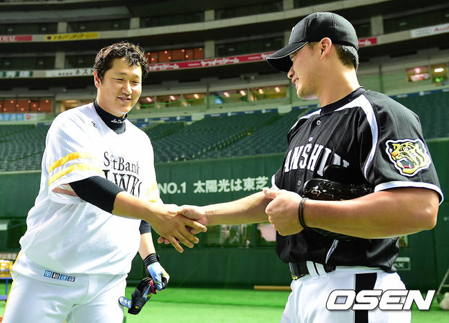 '빅보이' 이대호와 '끝판대장' 오승환이 23일 오후 일본 후쿠오카 야후옥션돔에서 열리는 '2014 일본프로야구' 소프트뱅크 호크스와 한신 타이거스의 경기를 앞두고 만나 인사를 나누고 있다.