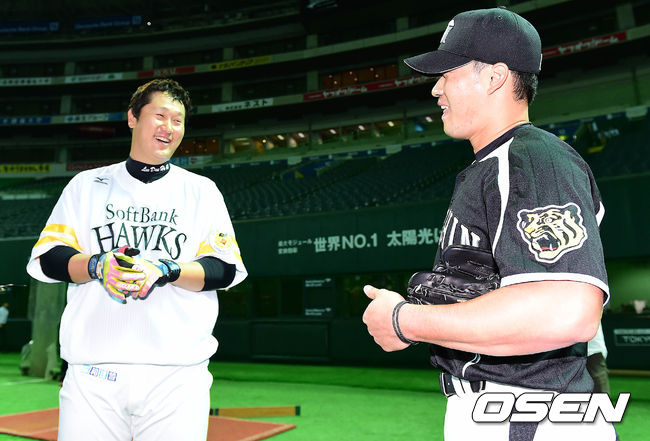'빅보이' 이대호와 '끝판대장' 오승환이 23일 오후 일본 후쿠오카 야후옥션돔에서 열리는 '2014 일본프로야구' 소프트뱅크 호크스와 한신 타이거스의 경기를 앞두고 만나 인사를 나누고 있다.