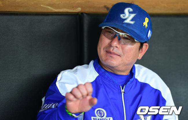 경기에 앞서 삼성 류중일 감독이 더그아웃에서 취재진과 이야기를 나누고 있다.