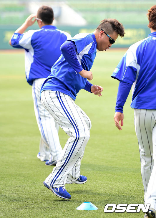 경기에 앞서 삼성 채태인이 훈련을 하고 있다.