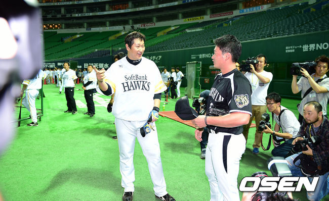 '빅보이' 이대호와 '끝판대장' 오승환이 23일 오후 일본 후쿠오카 야후옥션돔에서 열리는 '2014 일본프로야구' 소프트뱅크 호크스와 한신 타이거스의 경기를 앞두고 만나 인사를 나누고 있다.
