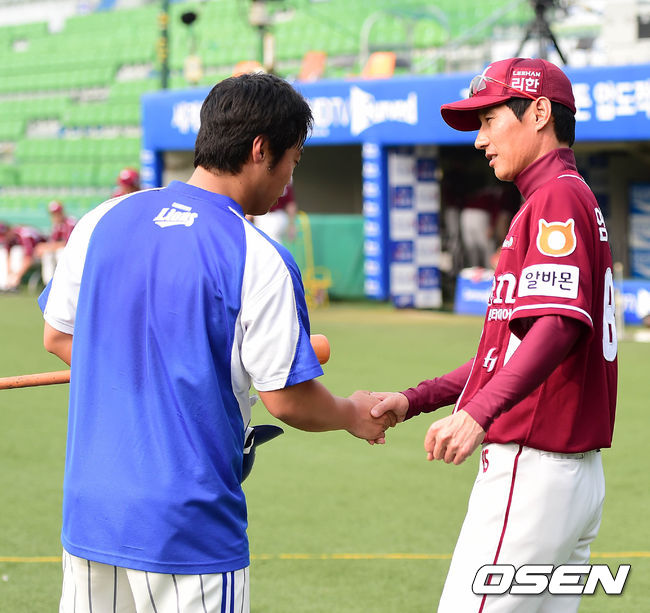 경기에 앞서 넥센 염경엽 감독이 삼성 김태완과 인사를 나누고 있다.