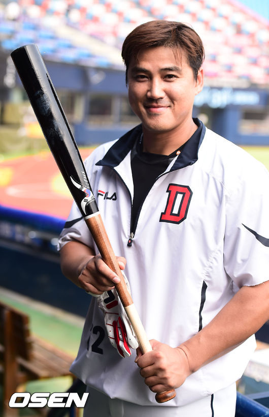23일 오후 서울 잠실구장에서 열린 2014 한국야쿠르트 세븐 프로야구 두산 베어스와 한화 이글스의 경기전 두산 홍성흔이 칸투에게 선물 받은 태극 무늬가 새겨진 방망이를 보여주고 있다.