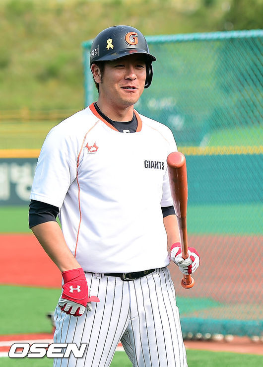 23일 오후 울산 문수야구장에서 열리는 '2014 한국야쿠르트 세븐 프로야구' 롯데 자이언츠와 KIA 타이거즈의 경기에 앞서 롯데 강민호가 번트훈련을 하던 도중 김시진 감독과 이야기를 나누고 있다.