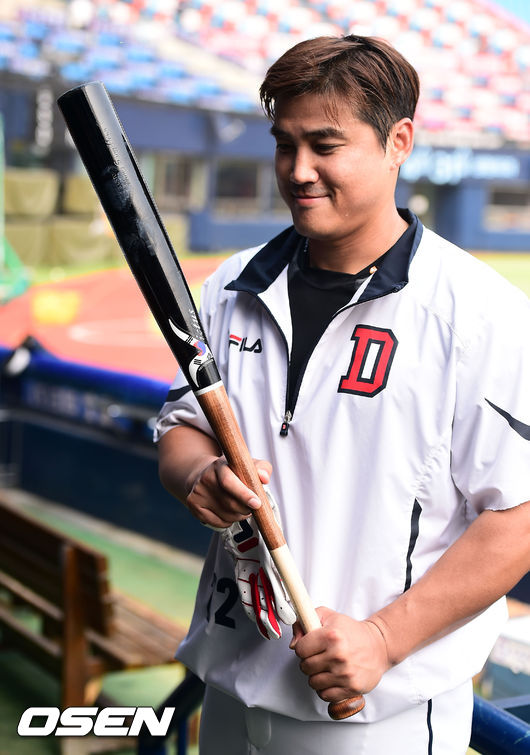 23일 오후 서울 잠실구장에서 열린 2014 한국야쿠르트 세븐 프로야구 두산 베어스와 한화 이글스의 경기전 두산 홍성흔이 칸투에게 선물 받은 태극 무늬가 새겨진 방망이를 보여주고 있다.