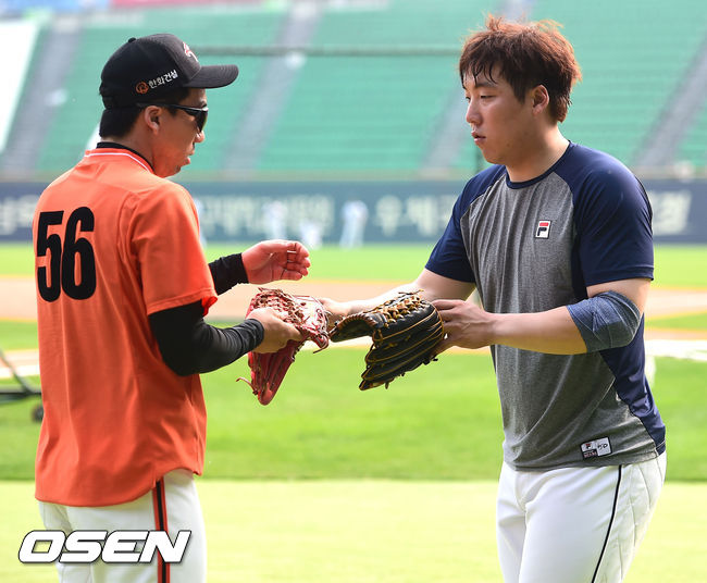 23일 오후 서울 잠실구장에서 열린 2014 한국야쿠르트 세븐 프로야구 두산 베어스와 한화 이글스의 경기전 두산 김현수가 한화 고동진에게 글러브를 전달하고 있다.