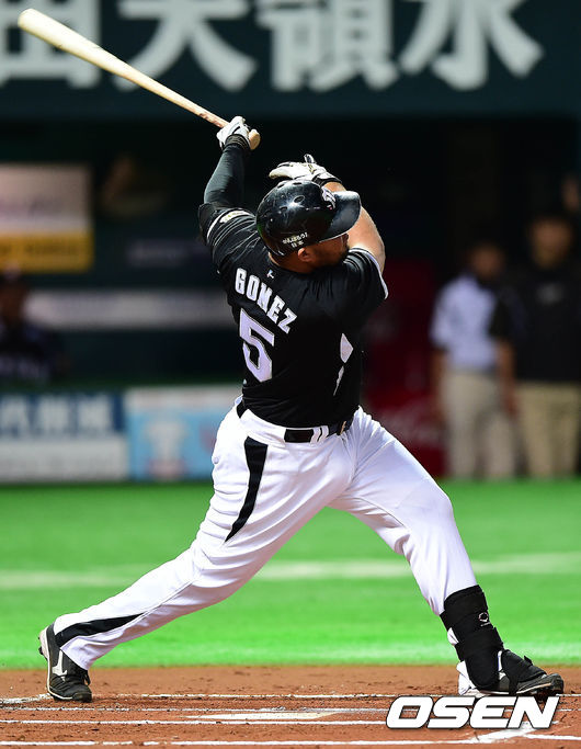 1회초 한신 공격 2사 1루 상황 고메스가 선제 좌월 투런포를 날리고 있다.