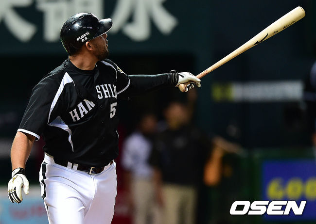1회초 한신 공격 2사 1루 상황 고메스가 선제 좌월 투런포를 날리고 타구를 바라보고 있다.
