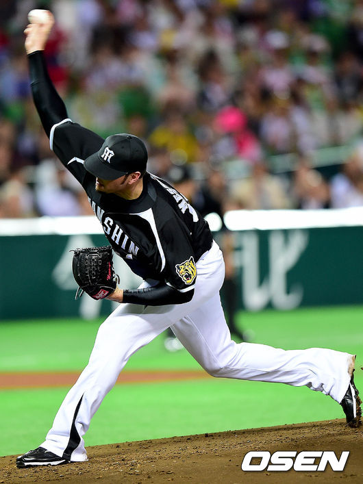 198cm의 장신 한신 선발 랜디 메신저가 힘차게 공을 뿌리고 있다.
