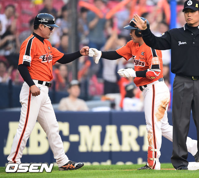 23일 오후 서울 잠실구장에서 열린 2014 한국야쿠르트 세븐 프로야구 두산 베어스와 한화 이글스의 경기, 1회초 무사 1,2루 한화 정근우가 선취 2타점 3루타를 날린뒤 이종범 코치와 하이파이브를 하고 있다.