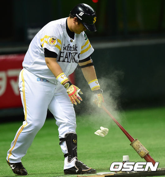2회말 소프트뱅크 공격 선두타자로 나선 이대호가 타석에 들어서기 전 배트에 로진을 바르고 있다.