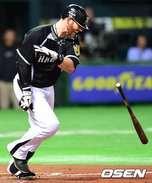 3회초 한신 공격 선두타자로 나선 맷 머튼이 외야플라이 타구를 날린 뒤 배트를 던지며 아쉬워하고 있다.