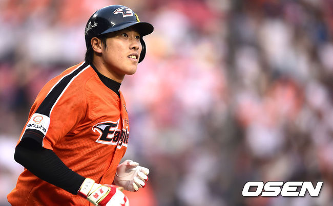 23일 오후 서울 잠실구장에서 열린 2014 한국야쿠르트 세븐 프로야구 두산 베어스와 한화 이글스의 경기, 2회초 한화 선두타자 정범모가 솔로홈런을 날리고 베이스를 돌고 있다. 3게임 연속 홈런.