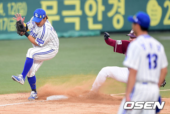 2회초 1사 2루 삼성 장원삼의 폭투때 3루수 박석민이 넥센 2루주자 유한준의 슬라이딩을 피하고 있다.