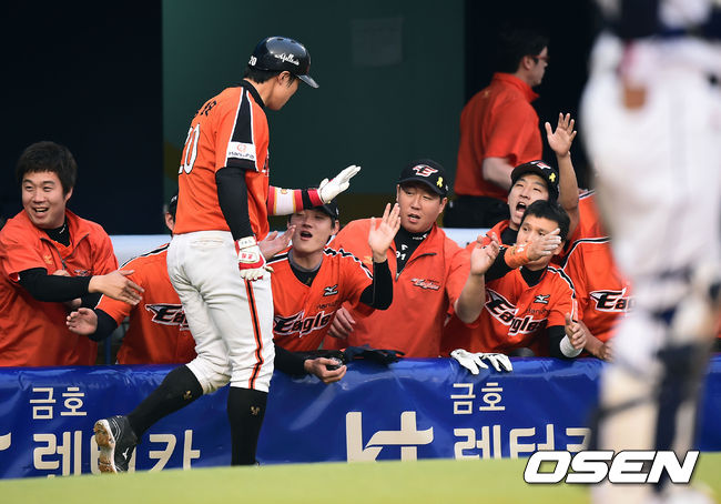 23일 오후 서울 잠실구장에서 열린 2014 한국야쿠르트 세븐 프로야구 두산 베어스와 한화 이글스의 경기, 2회초 한화 선두타자 정범모가 솔로홈런을 날리고 동료들의 축하를 받고 있다.