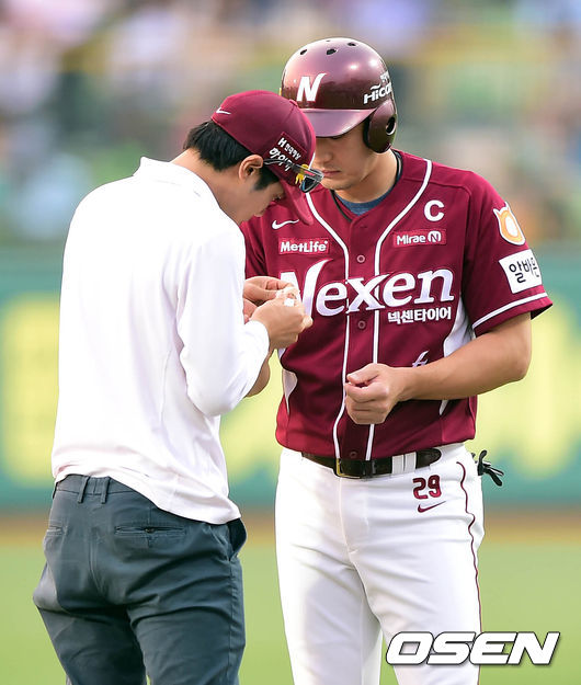 1회초 경기 도중 손가락을 다친 넥센 이택근이 팀관계자의 치료를 받고 있다.