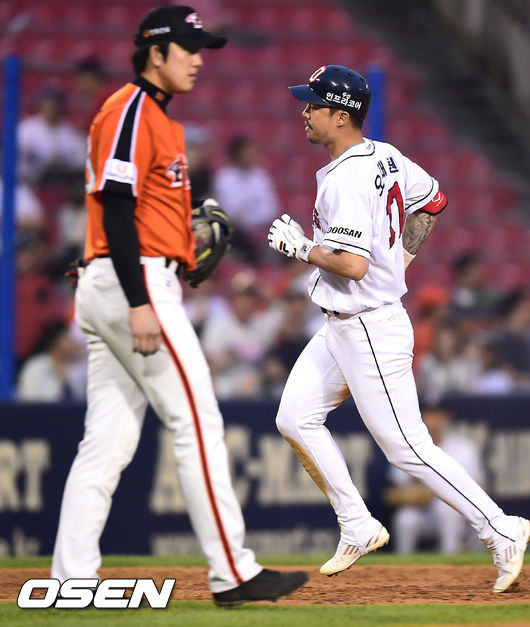 23일 오후 서울 잠실구장에서 열린 2014 한국야쿠르트 세븐 프로야구 두산 베어스와 한화 이글스의 경기, 3회말 1사 두산 오재원이 솔로홈런을 날리고 베이스를 돌고 있다.