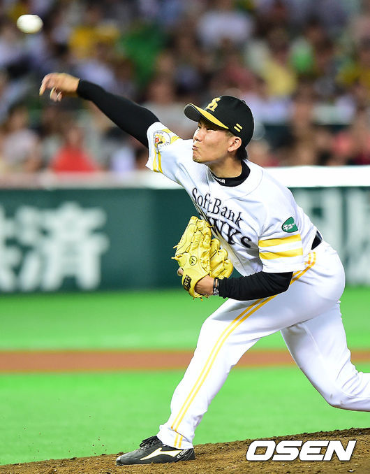 6회초 한신 공격 때 마운드에 오른 소프트뱅크 투수 센가 고다이가 힘차게 공을 뿌리고 있다.