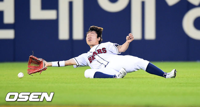 23일 오후 서울 잠실구장에서 열린 2014 한국야쿠르트 세븐 프로야구 두산 베어스와 한화 이글스의 경기, 4회초 1사 1루 한화 정범모의 타구를 두산 정수빈 중견수가 놓치고 있다.
