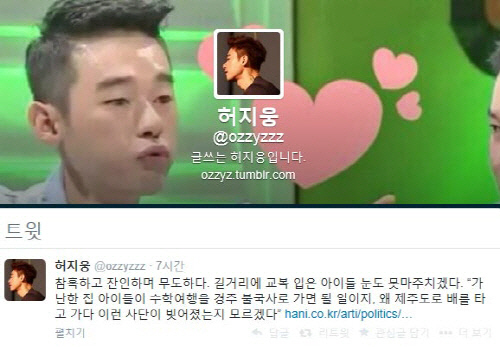 허지웅은 23일 자신의 트위터를 통해 “참혹하고 잔인하며 무도하다”며 조광작 목사의 발언에 불편한 심기를 드러냈다. 한편 부적절한 발언으로 논란에 휩싸인 한기총 부회장 조광작 목사는 부회장직에서 사퇴했다.
