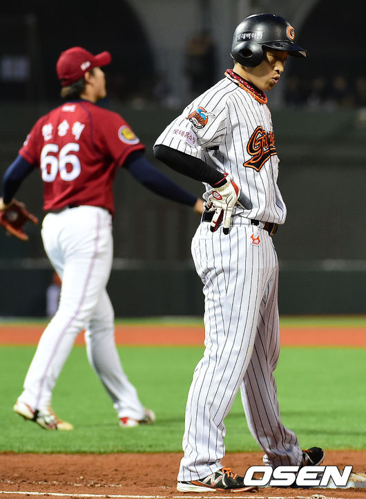 4회말 1사 1,2루 롯데 손아섭이 박종윤의 1루 직선타때 황급히 1루로 귀루한 뒤 숨을 고르고 있다.