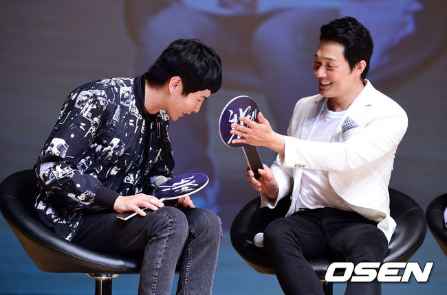이민기, 박성웅이 욕망지수 테스트를 하고 이민기가 '욕망 황제'로 선정되자 박성웅이 축하해 주고 있다.