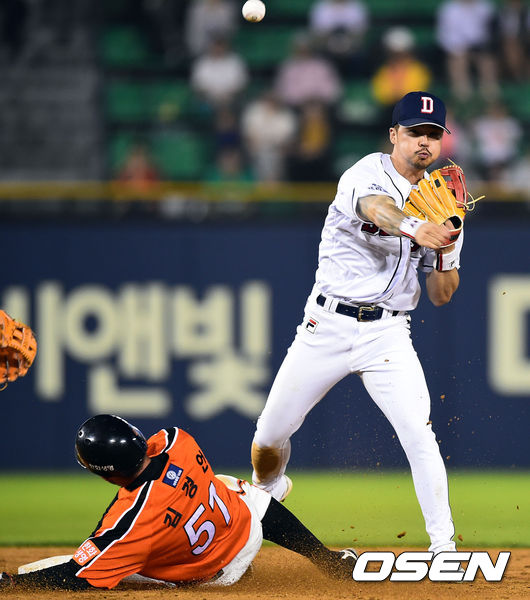 23일 오후 서울 잠실구장에서 열린 2014 한국야쿠르트 세븐 프로야구 두산 베어스와 한화 이글스의 경기,5회초 무사 1루 한화 정근우의 내야땅볼때 1루 주자 김경언이 두산 오재원에게 포스아웃되고 있다.