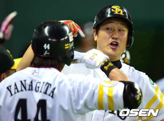 6회말 소프트뱅크 공격 무사 1, 2루 상황 이대호가 역전 중월 스리런포를 날리고 홈을 밟은 뒤 야나기타를 비롯한 더그아웃 동료들과 인사를 나누고 있다.