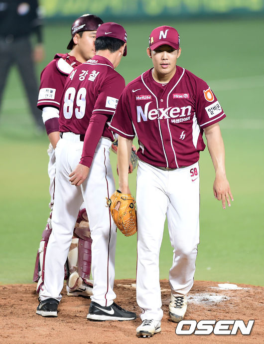 6회말 무사 1루에서 넥센 금민철이 마운드를 내려가고 있다.