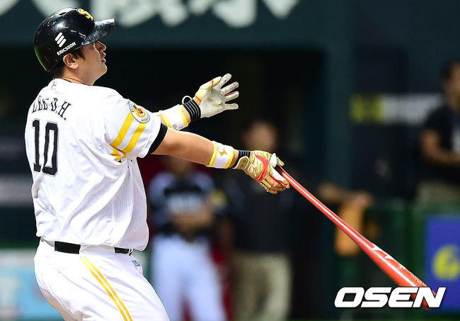 6회말 소프트뱅크 공격 무사 1, 2루 상황 이대호가 역전 중월 스리런포를 날리고 타구를 바라보고 있다.