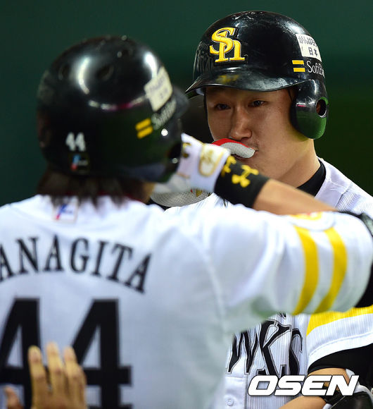 6회말 소프트뱅크 공격 무사 1, 2루 상황 이대호가 역전 중월 스리런포를 날리고 홈을 밟은 뒤 야나기타를 비롯한 더그아웃 동료들과 환호하고 있다.