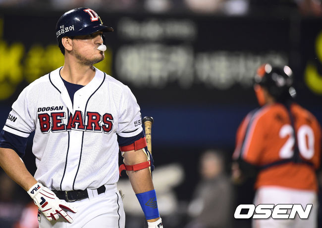 23일 오후 서울 잠실구장에서 열린 2014 한국야쿠르트 세븐 프로야구 두산 베어스와 한화 이글스의 경기,5회말 2사 2루 두산 칸투가 삼진아웃 당한뒤 아쉬워하며 더그아웃으로 들어가고 있다.