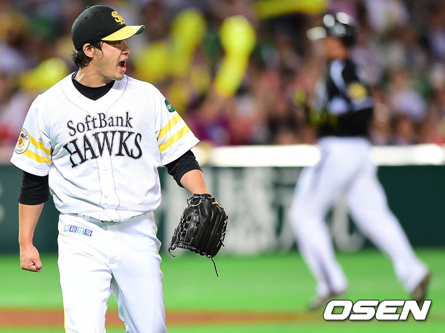 7회초 한신 공격 2사 만루 상황 대타 아라이 다카히로를 삼진으로 이끌며 무실점으로 이닝을 막아낸 소프트뱅크 투수 이가라시 료타가 환호하고 있다.