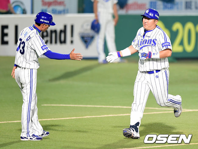 6회말 2사에서 삼성 최형우가 우중월 솔로 홈런을 치고 김재걸 코치와 하이파이브를 하고 있다.