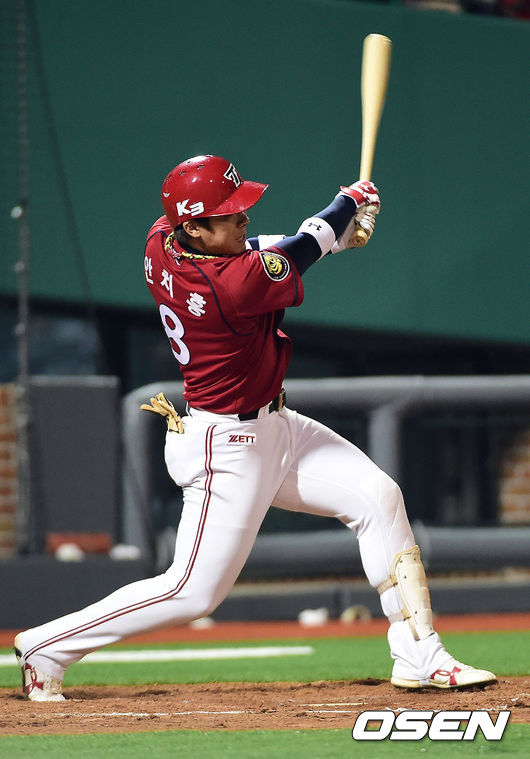 8회초 1사 1,2루 대타로 나선 KIA 안치홍이 1타점 적시타를 때리고 있다.