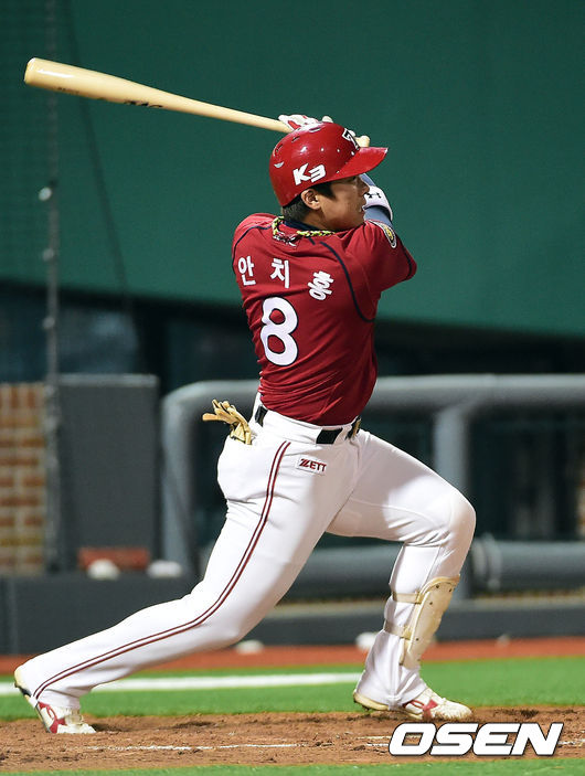 8회초 1사 1,2루 KIA 안치홍이 1타점 적시타를 때리고 있다.