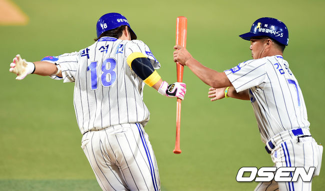 6회말 2사에서 삼성 박석민이 좌월 솔로 홈런을 치고 배트를 김평호 코치에 건네고 있다.