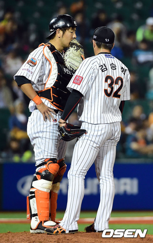 9회초 1사 2루 KIA 나지완 타석때 롯데 강민호가 마운드에 올라 김승회가 이야기를 나누고 있다.