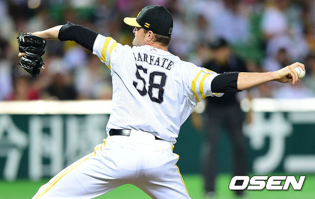 9회초 한신 공격 때 마운드에 오른 소프트뱅크 투수 데니스 사파테가 힘차게 공을 뿌리고 있다.
