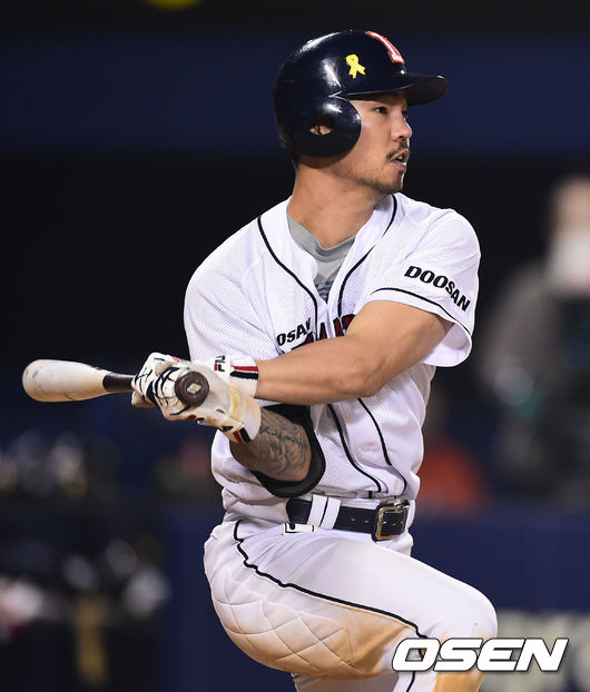 23일 오후 서울 잠실구장에서 열린 2014 한국야쿠르트 세븐 프로야구 두산 베어스와 한화 이글스의 경기,6회말 2사 만루 두산 오재원이 3타점 2루타를 날리고 있다. 이후 한화 수비의 실책을 틈타 오재원도 득점 성공