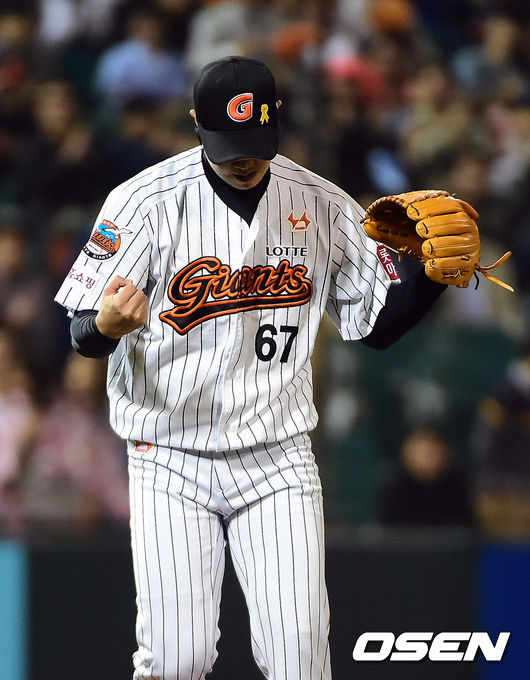 9회초 2사 만루 롯데 김성배가 KIA 백용환을 삼진으로 잡아낸 뒤 기뻐하고 있다./youngrae@osen.co.kr