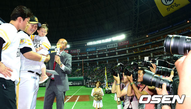 경기 종료 후 수훈 선수로 선정돼 단상에 오른 소프트뱅크 이대호가 딸 효린양과 미소짓고 있다./dreamer@osen.co.kr