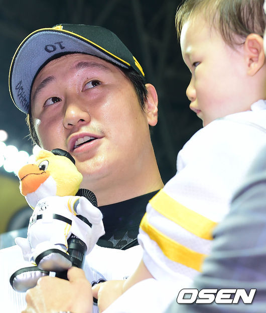 경기 종료 후 수훈 선수로 선정돼 단상에 오른 소프트뱅크 이대호가 딸 효린양과 함께 사회자의 질문에 답하고 있다./dreamer@osen.co.kr