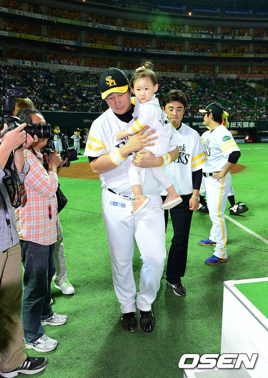 경기 종료 후 수훈 선수로 선정돼 단상에 오른 소프트뱅크 이대호가 딸 효린양과 함께 발걸음을 옮기고 있다./dreamer@osen.co.kr