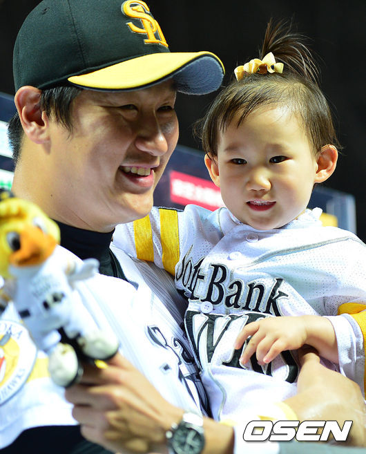 경기 종료 후 수훈 선수로 선정돼 단상에 오른 소프트뱅크 이대호가 딸 효린양과 함께 미소짓고 있다./dreamer@osen.co.kr